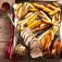 voor 4 personen 750 g varkensrollade * 100 g boter of vloeibaar bakproduct * 2 rode uien, in smalle partjes * 1 winterwortel, in blokjes * 1 eetl. rozemarijn[...]