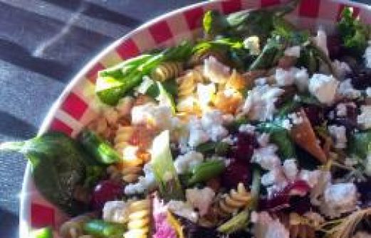 Ingrediënten Porties : 4 400 g fusilli 300 g sugar snaps, schuin gehalveerd 5 eetl. extra virgin olijfolie, apart te verwerken 400 g kipfilet 4 eetlepels amandelschaafsel 125 g rucola (of slamelange) 1 eetl. balsamicoazijn 225 g pitloze blauwe druiven 3 eet [...]