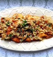Ingrediënten Porties : 4 30 gr bloem 1/4 theelepel zout peper 2 eiwitten 450 gr tilapiafilet 25 gr paneermeel (of gedroogde broodkruimels) 35 gr grof maïsmeel 1/2 theelepel gedroogde basilicum Bereidingswijze Voorbereiding: 15 min › Bereiding: 1 [...]