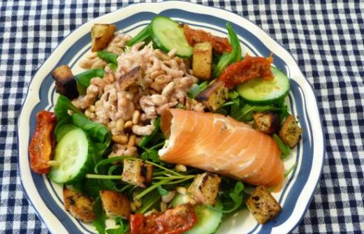 voor 5 personen - gemengde sla. - 300 gr. Hollandse garnalen, - 200 gr. gerookte zalm, - kruidenkaas, bv. Paturain o.i.d. - (zelfgemaakte) cocktailsaus, voor de garnering: - (zelfgemaakte) croutons, - geroosterde pijnboompitten, - zongedroogde tomaatjes, - komkommer. Voorb [...]