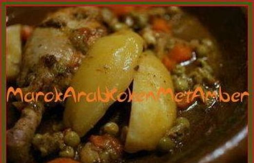 6 kipdrumsticks; 150 gram doperwtjes (diepvries); 4 wortelen; 6 vastkokende aardappelen; 1 ui; 1/2 bosje verse koriander; 3 eetlepels olijfolie; 1/2 koffielepel "ras el hanout" (Marokk.winkel); 1/2 koffielepel paprikapoeder; 1/2 koffielepel gemalen komijn; 1/2 koffielepel kurkuma; [...]