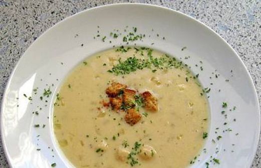 voor 10 personen 1 stukje chorizo (1 ons) 5 dl zonnebloemolie 1 liter krachtige kippenbouillon 15 (of iets minder) teentjes (roze) knoflook, gepeld 300 gram kruimige aardappelen, geschild en in stukken 2 dl slagroom 1 eidooier peper, zout en sereh (gemalen citroengras) bieslook, gekn [...]