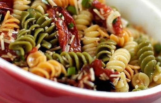 voor 3 personen - blikje roze zalm - halve komkommer, in blokjes - 3 a 4 augurken, in blokjes - 150 gr. gekookte en afgekoeld penne of fussili - 2 eetlepels mayonaise (olijvonaise) - 2 eetlepels Sandwich Spread Mediterraan - peper - zout - 150 gr. rucola - paar takjes dille (voor ga [...]