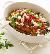 voor 4 personen 2 eetl. olie, 2 aubergines, in kleine blokjes, 500gr. gehakt h.o.h, 1 theel. korianderpoeder, 1 blik blokjes tomaat (a400gr), 2 bakken aardappelpuree met olijfolie (a 450gr.), 175gr. gemalen oude kaas, 2 theel. zout peper, zout Hulpmiddelen Grote ovenschaa [...]