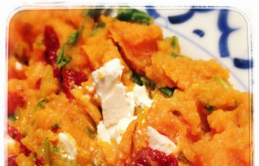 Zoete aardappel. Gaar koken. Stampen. Beetje bouillon toevoegen. Rucola erdoor. Zongedroogde tomaatjes & feta. Ideaal voor de #MeatlessMonday.