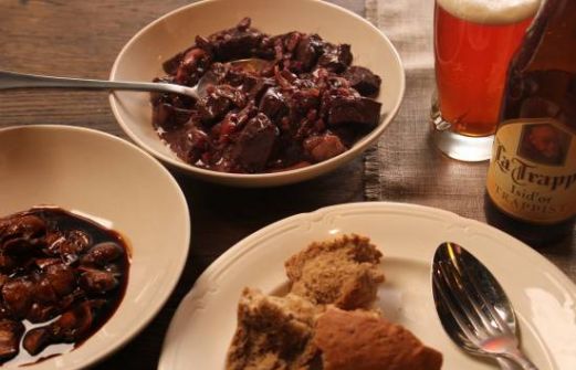 1 kilo vlees van hazenbouten 2 a 3 sjalotten 100 gram ontbijtspek blokjes 1 eetlepel karamel 1 eetlepel appelstroop 2 dl rode wijn 1 theelepel provinciaalse kruiden wildbouillon ongezouten 1 flesje la Trappe Isid`or Bereidingswijze Het vlees in een weinig boter stevig aanbak [...]