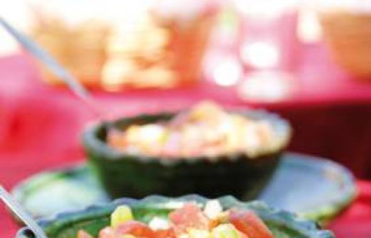 voor 4 personen 3 vleestomaten, ontveld en ontpit 1/2 komkommer, geschild en ontpit 1 paprika, gegrild, ontpit en ontveld 1/2 rode ui, gesnipperd 2 el olijfolie 1/2 el natuurazijn 1/2 tl komijnpoeder 1/2 tl paprikapoeder, mild 1/2 el bladpeterselie, gehakt 1/4 el koriander, gehakt [...]