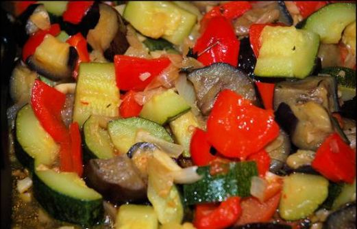 voor 4 personen 1 grote aubergine 2 kleine courgettes 3 vleestomaten 2 kleine winterwortels ½ bakje kastanje champignons 2 teentjes knoflook fijngehakt 1 rode paprika 1 groene paprika 2 rode uien in ringen gesneden Handje peterselie gesnipperd Handje basilicum gesnipperd 1 [...]