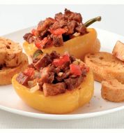 voor 4 personen 3 a 4 gekleurde paprika`s 500 gr gehakt 1 ui 1 teentje knoflook 1 potje kappertjes 1 thl sambal 1 blikje tomatenpuree 1 thl suiker 2 a 3 eetl groene pesto geraspte kaas of cheddarkaas. verse basilicum. Hulpmiddelen Ovenschaal Voorbereiding Oven voorve [...]