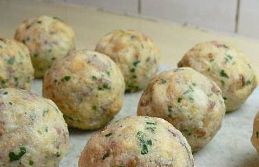 voor 4 personen 1 ui 20 gram boter 300 gram oud witbrood of broodkruim 100/150 gram klein gesneden spek 3 eieren 1/8 liter melk 2 eetlepels meel (ongeveer) 1 eetlepel gehakte platte peterselie 1 eetlepel bieslook 1 eetlepel gesmolten of goed te kneden boter peper, zout en majoraan [...]