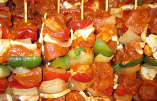 voor 8 personen 500 gr varkenshaas of hamlappen 500 gr kipfilet 2 teentjes knoflook 2 tl cayennepeper 2 tl extra milde paprikapoeder 5 el olijfolie Snufje zwarte peper uit de molen Snufje zeezout fijn 4 rode uitjes (middel) 1 rode paprika 1 gele paprika 1 bosje selderij 1 courget [...]