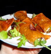 Voor de flensjes: 100 gr. (Bioculinair) boekweitmeel 50 gr. (Bioculinair) bruine bakmix snufje zout 2 eieren ca. 2 dl. Melk 1 bosje koriander maiskiemolie voor de roerbakgroente: 1 bosje lente-ui 150 gr. Shii-take 1 rode paprika 150 gr. Tauge 1 eetlepel maiskiemolie zout en ve [...]