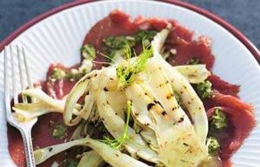 voor 4 personen 1 zakje rucola (sla, 40 g, biologisch) 50 g Parmezaanse kaas, geraspt 2 el pijnboompitten 6 el olijfolie 1 venkel 2 pakjes carpaccio (a ca. 125 g) Bereidingswijze 1. Doe de rucola, de kaas, de pijnboompitten en 4 el olie in de keukenmachine. Pureer tot pesto. B [...]