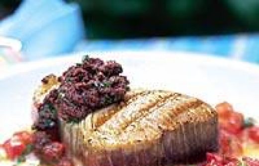 voor 4 personen 4 (roma)tomaten 15 gr verse basilicum 150 ml milde olijfolie 2 el balsamicoazijn 2 sjalotten, gesnipperd 2 el kappertjes, grofgehakt 4 tonijnsteaks versgemalen zeezout en zwarte peper 1 ciabatta 4 eetlepels tapenade van zwarte olijven Hulpmiddelen Grillpl [...]