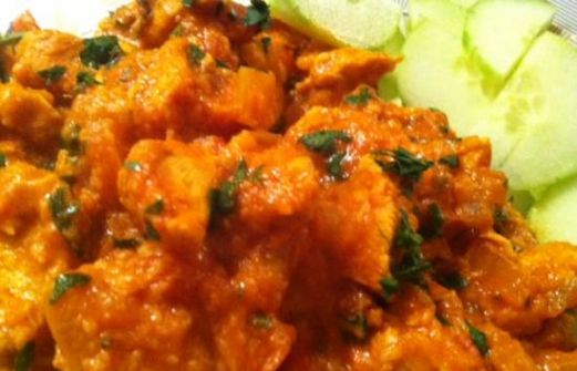voor 4 personen 500 g kipfilet 1 grote ui 1 rode peper 1 teentje knoflook stukje gemberwortel 1 flinke tl kurkuma 1 flinke tl kerrie 1 flinke tl korianderzaad 1 blikje tomatenpuree 2 tomaten 3 el geraspte kokos 150 ml kookroom olijfolie 1 tl suiker (verse koriander) V [...]