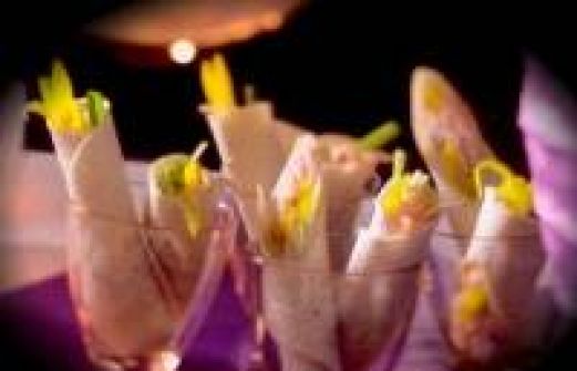 voor 8 personen 4 kant-en-klare tortilla`s met een doorsnede van 25 cm 2 eetlepels honing mespunt cayennepeper 1 eetlepel ketjap manis 2 lente-bosuitjes 1 gele paprika 150 g gerookte kipfilet of kiprollade (vleeswaren) Bereidingswijze Verwarm de tortilla`s even in een droge h [...]