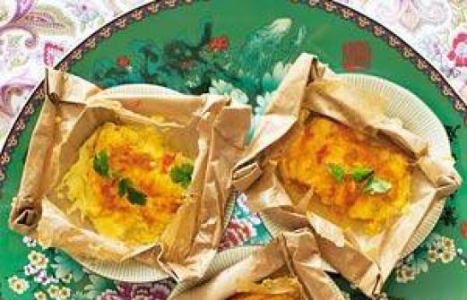 voor 4 personen 2 sjalotten 2 tenen knoflook 1 rode peper, steelaanzet verwijderd 3 cm verse gember (zakje 150 g), geschild 2 tl gemalen kurkuma 2 tl sambal badjak 2 el zonnebloemolie 300 g schelvisfilet, in stukjes 1 ei 1 pakje kokosmelk (200 ml) Hulpmiddelen Bakpapier, [...]