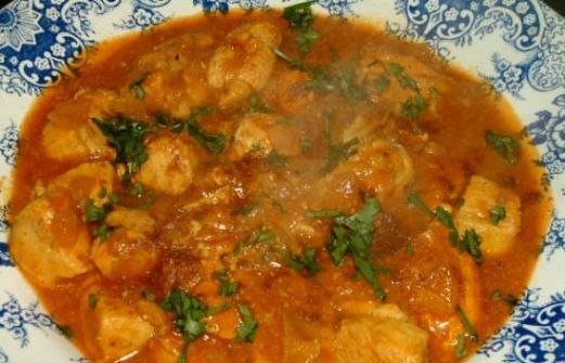 voor 6 personen 750 g kipfilet, in stukjes gesneden 60 ml (4 e) 3 uien, fijn 2 teentjes knoflook, fijn 3 cm verse gember, fijn 1 e korianderpoeder 1 t komijnpoeder 1/2 t geelwortel (kurkuma) 1/2 t cayennepeper 1/4 t kaneelpoeder mespunt kruidnagelpoeder mespunt gemalen kardemom z [...]