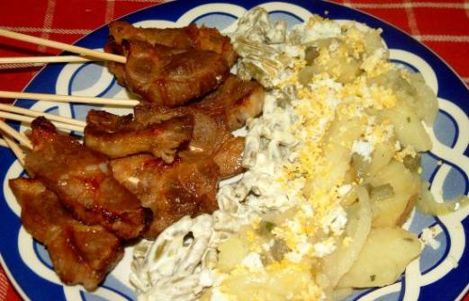 voor 6 personen 1 kg schouderkarbonade of krabbetjes kippenbouillon 1 e marmite (supermarkt) 5 e suiker 1 e meel 2 e ciderazijn of witte wijnazijn 3 e gembersiroop of gemberpoeder 1 t knoflookpoeder of 2 teentjes knoflook, fijn olie voor bakplaat zout peper Bereidingswijze [...]