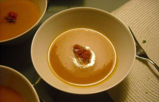 voor 6 personen 3 teentjes knoflook - 2 grote uien- 1 tl. koriander, gemalen - 2 el. olijfolie - 2 theelepels gedroogde tijm - 1 niet al te grote Hokkaido pompoen (ronde fel oranje)- 1 pot gevogeltefond - 3 kippenbouillontabletten - 2 el. gedroogde oregano - Vers gemalen zwarte pepe [...]