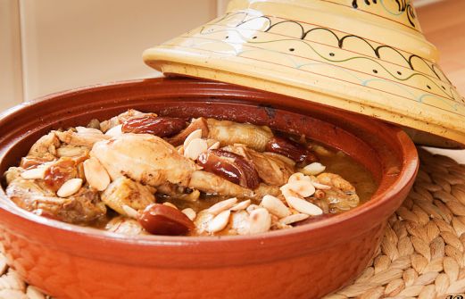 Ingrediënten: - 6 stukken kip, poten, drumsticks, of kipkarbonades - 4 el arachide- of zonnebloemolie - 2 uien, geschaafd in halve ringen - 2 tl kaneel - 3/4 tl foelie - ¼ tl nootmuskaat - 1 el honing - 250 g dadels, zonder pit - sap van een ½-1 citroen - snufje sa [...]