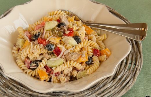 Ingrediënten: - 250 gram fusili - 1 rode en 1 groene of gele paprika - ½ tot een hele komkommer in kwart plakjes gesneden - 1 rode ui in ringen en die door de helft gesneden - 20 zwarte olijven - 1 eetlepel kappertjes - 1 blikje tonijn in olie - 4 - 6 eetlepels mayonaise - 3 [...]