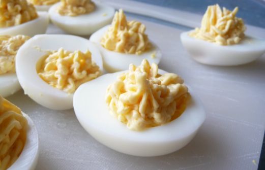 Zo gewoontjes, zo Hollands, maar zo lekker. En ze zien er ook best gezellig uit. Kook 10 eieren hard, halveer ze haal het eigeel eruit. Prak dit met 3 el mayonaise, oude geraspte kaas, zout, peper en wat chilipeper. Gebruik een spuitzak om de eitjes te vullen. Jam!