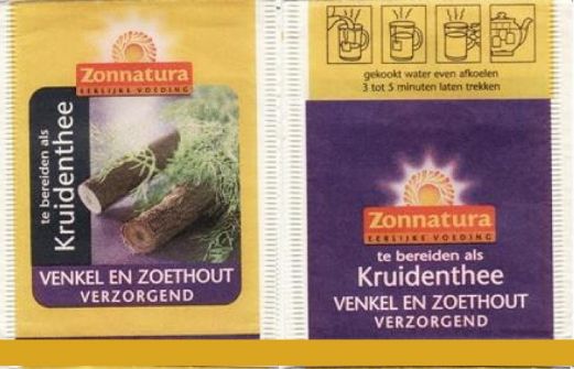 Zonnatura kruidenthee, inmiddels uit het assortiment (maar klinkt héérlijk): venkel&zoethout, amandel&cichorei, zoethout&kaneel. Gelukkig ook goed zelf te bereiden met behulp van theezeefjes of filterzakjes .