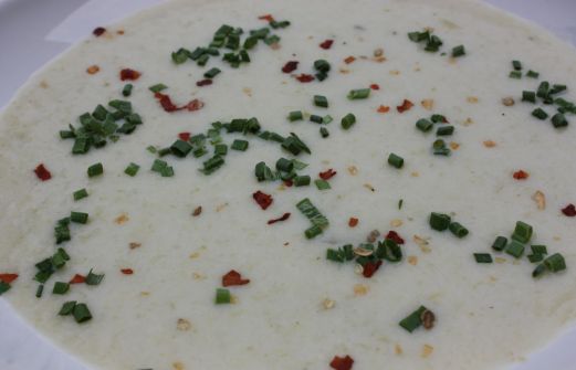 Een heerlijke koude soep. 1 ui, 750 gram prei, 2 aardappelen (ca. 250 gram), bouillonpoeder, 35 gram boter, 4 dl melk, 1/4 liter slagroom, 1/2 tl nootmuskaat, zout, 5 sprietjes bieslook, chiliflakes Ui snipperen, prei in ringen snijden, wassen en laten uitlekken. Aarda [...]