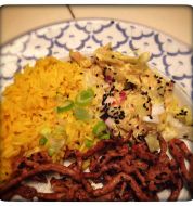 300 gram rijst, 2 rode paprika's, 3 el olie, 500 gram shoarmavlees, 1 gesnipperde ui, 500 gram gesneden spitskool, 1 pakje gezeefde tomaten, 3 el tomatenketchup, peper De paprika's in blokjes snijden. In braadpan olie verhitten, shoarmavlees op hoog vuur rondom bruin bakken. Het vuur l [...]