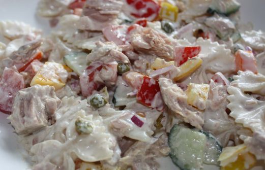 gegeten 4 augustus Een recept uit een Good Food van 1999! 250 gram fusili, 1 kleine rode ui, 2 verschillende kleuren paprika's, 2 tomaten, 1,5 el kappertjes, 1/2 komkommer, 6 afgestreken el mayonaise, 3 el citroensap, 2 blikjes tonijn Kook de pasta beetgaar, snipper de ui, snijd [...]