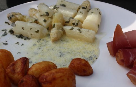 gegeten op 17 juni voor 2 personen: 1 kg asperges, 25 gram boter, 1 dl droge witte wijn, 1 tl suiker, zout, peper, nootmuskaat, 4 el crème fraîche, 6 takjes peterselie Asperges schillen en in stukjes van ca. 4 cm snijden. Boter smelten, aspergestukjes erdoor roeren, samen met de wijn, [...]