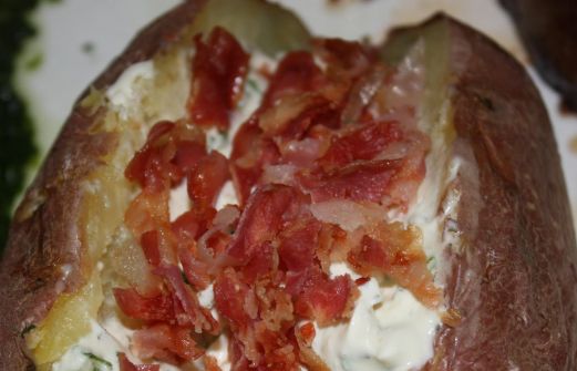 gegeten op 15 april per persoon 2 plakjes ontbijtspek/bacon "bakken" in de magnetron. Af laten koelen en klein knippen. Aardappels poffen in de magnetron, bakje roomkaas met kruiden losroeren. 3 takjes peterselie en 5 sprietjes bieslook erboven fijnknippen en erdoor roeren. Aardappels insn [...]