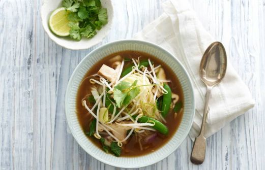 Ingrediënten 3 cm verse gember 100 g shiitakes 95 g Engelse ossenstaartsoep (pakje) 2 liter kraanwater 400 g oosterse wokgroente 400 g mihoen (koelvers) 125 g taugé 1 limoen (schoongeboend) 2 el vissaus zet alles op m [...]