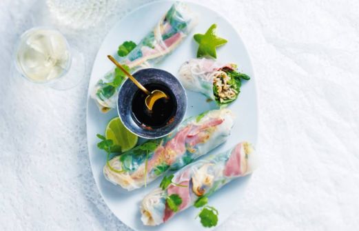 Ingrediënten 90 g sobanoedels 100 g shiitakes (paddenstoelen) 2 el arachideolie 100 g aspergetips 1 el sesamzaad 4 el Japanse sojasaus 1 el pindakaas met stukjes noot 3 el limoensap 16 rijstvellen (zak 250 g) 15 g koriande [...]