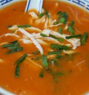 voor 8 personen # 1 liter water # 1 liter tomatensap # 2 kipfilets # 2 kippenbouillonblokjes # 1 ui # 2 tenen knoflook # blikje tomatenpuree # 6 el suiker # 4 el ketjap (manis) # 2 el azijn # 1 borrellepeltje sambal # 1 borrellepeltje djahe (gemberpoeder) # 1 borrelle [...]