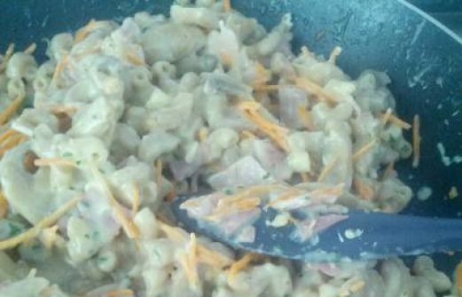 voor 1 personen Kliekje macaroni, plakjes champignon uit blik, knoflookpoeder, melk, peterselie, ongezouten en ongeroosterde cashews, kaassaus, peen julienne, plakjes vleeswaren, olijfolie Voorbereiding Knip de vleeswaren en cashewnootjes klein Bereidingswijze Olijfolie in de koe [...]