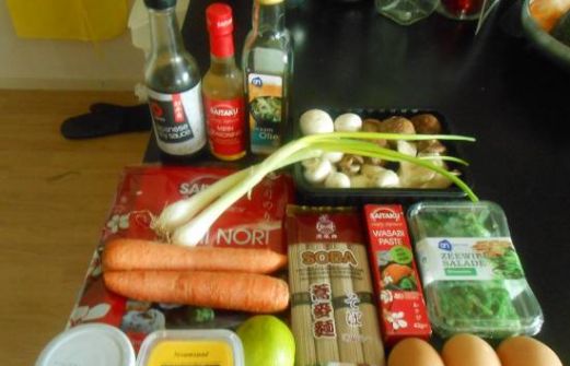 voor 4 personen 150 gr. soba noedels,2 zakjes dashi (instant bouillon),250 gr. paddestoelenmix,1 el sesamzaad,wokolie. voor de omelet; 3 eieren, 1 norivel,1 el mirin, 1 tl japanse sojasaus, beetje sesamolie, 3 bio wortelen, voor de saus; 1 el sesamolie, 3 el japanse sojasaus, 1 el gembersi [...]