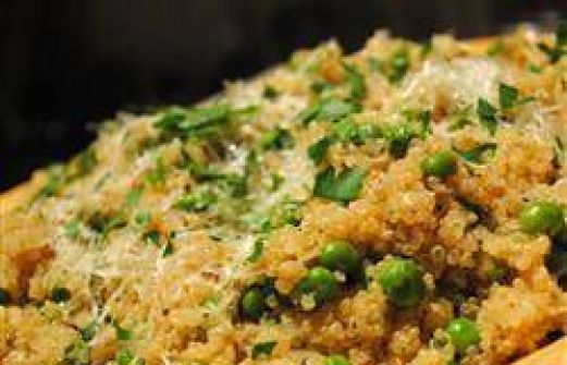 voor 6 personen Ingrediënten 15 gr boter 170 gr ongekookte quinoa 475 ml kippenbouillon 40 gr ui, versnipperd 1 teentje knoflook, fijngehakt 1 theelepel fijngehakte verse tijm 1/2 theelepel zwarte peper 115 gr erwten uit de diepvries 120 ml geraspte Pecorino Romano kaas (of Par [...]