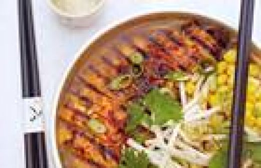 voor 4 personen 4 kleine kipfilets ½ theelepel chilivlokken 1 eetlepel sojasaus 1 eetlepel sake 1 eetlepel mirin 1 theelepel fijne tafelsuiker 1 eetlepel zonnebloemolie 200 g gedroogde ramennoedels 1½ liter kippenbouillon 1 eetlepel miso 200 g maïs uit blik, gesp [...]