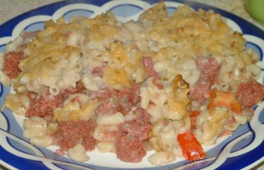 voor 2 personen Gerookte spek in blokjes 1 ui, fijn 2 tomaten in blokjes 1 blik corned beef in blokjes peper 1/2-1 t aromat oude kaas gaar en warm macaroni witte saus of aangemaakt champignonroomsoep, uit een pakje (voor makkelijk) Elke dag iets lekkers! 4 x Smult magazine &eac [...]