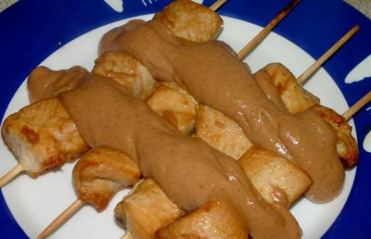 voor 4 personen 4 kipfilet, in saté blokjes gesneden voor marinade 2 t ketjap manis (ABC) 2 t citroensap 1 t kerriepoeder 2 teentjes knoflook uit de pers 3 e olie Marineer blokjes kip 2 uur en steek aan saté stokjes. Grill tot gaar en goudbruin. Elke dag iets le [...]