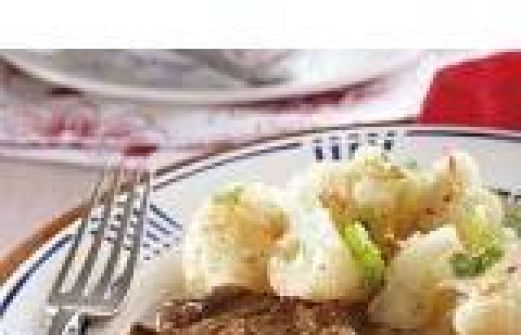 voor 4 personen 4 sukadelapjes van circa 200 g per stuk 4 peperkorrels 2 jeneverbessen 2 kruidnagels 1 stukje foelie 2 blaadjes laurier 1 grote ui, gesnipperd 1 wortel, in stukken 3 dl rode wijn zout en peper 2 el boter 3 dl warme vleesbouillon van tablet of uit pot Voor de bloe [...]
