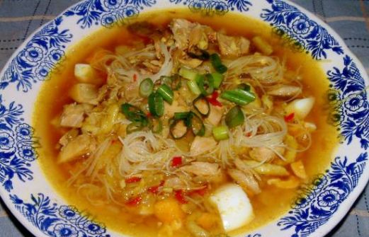 voor 6 personen 1200-1500 g kip, in stukken 2 liter water 3 cm verse gember, in plakken 1 kleine ui, grof gehakt serehstengel gekneusd 3 pimentkorrels zwarte gekneusde peper 50 g margarine of bakolie 2 uien, fijn 1 teentjes knoflook 4 kemirienoten, geraspt 3 e kerrie djawa of een [...]