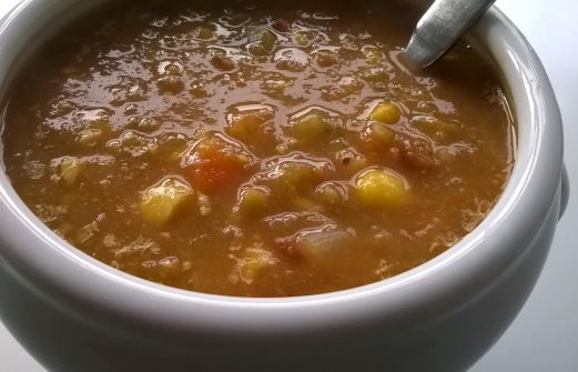 Groot blik of 500 gram zelf gekookte bruine bonen, 2 uien fijn gesnipperd, teen knoflook gehakt, blikje tomatenpuree, 2 tomaten in blokjes, 1 prei in dunne ringetjes, 1 paprika in kleine blokjes, klein blikje mais of diepvries, 1 stengel bleekselderij in kleine stukjes, 1 1/2 liter groentebouil [...]