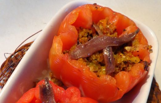 Coeur de boeuf tomaten met paprika, olijven en Parmezaanse kaas.