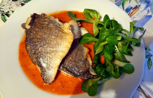 Het is een voortreffelijke paprikasaus die goed past bij bijvoorbeeld gegrilde tonijn en zeeduivelfilets. Op mijn buurtmarkt hadden ze die niet en heb ik dorade filets genomen. Ook lekker. Ingrediënten voor de de paprikasaus: 600 ml visbouillon 85 ml droge vermout (Noilly Prat of Ma [...]