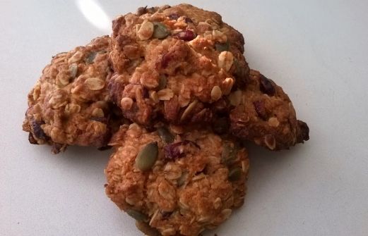 Meusli koekjes 65 gram volkoren speltmeel, 50 gram hele havervlokken, 50 gram kokosrasp, 35 gram gedroogde cranberry's, 25 gram pompoenpitten, snufje roze Himalayazout of (Keltisch) zeezout, 1/4 theelepel wijnsteenzuurbakpoeder, 45 ml agav estroop, 65 gram kokosolie gesmolten. Verwarm de ove [...]