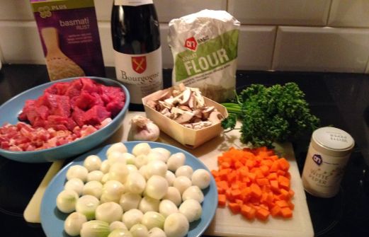 gestoofd in rode Bourgogne-wijn, champignons, uitjes, en reepjes spek. Andere