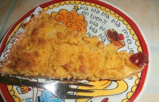 Vanmorgen werden we al rond 08.30 uur verrast door mijn vader die voor ons een kruimeltjesvla met abrikozenvulling meebracht van hun favoriete banketbakker. Er wordt vandaag hier flink geklust; een nieuwe laminaatvloer voor de bovenverdieping! Heerlijk, lekker alles fris en nieuw!